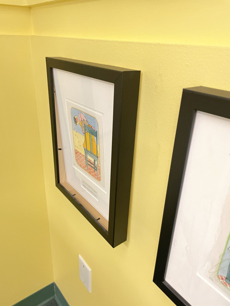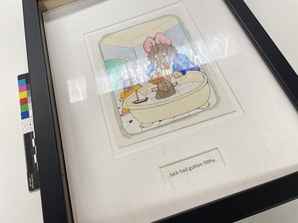 Other issues stemmed from the art being at children’s height. The matting and glazing packages had come loose from the frames in a few instances from being pushed inward. Others, such as the illustration “Jack had gotten filthy” had been drawn on with yellow crayon. The crayon marks were not easily removable and needed evaluation by the conservation team to improve.