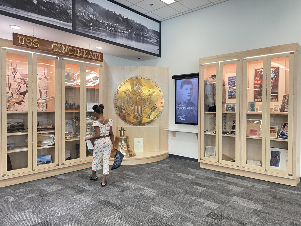 Located on the second floor at the top of the social staircase, a new purpose built space was built for the Veteran’s exhibit where artifacts are displayed in concert with stories provided by a digital exhibit and recorded interviews. The Book of Homage is highlighted with the pages turned periodically to reveal lists of names. Original War Bond posters, that were conserved and matted by the Preservation Lab, show the Victory Book Campaign requesting Americans donate books to their local library. War Bond posters will be rotated periodically to protect the vibrant printed colors from fading and the papers from darkening, but perhaps more importantly, show the wide range of art and messages conveyed during times of war.