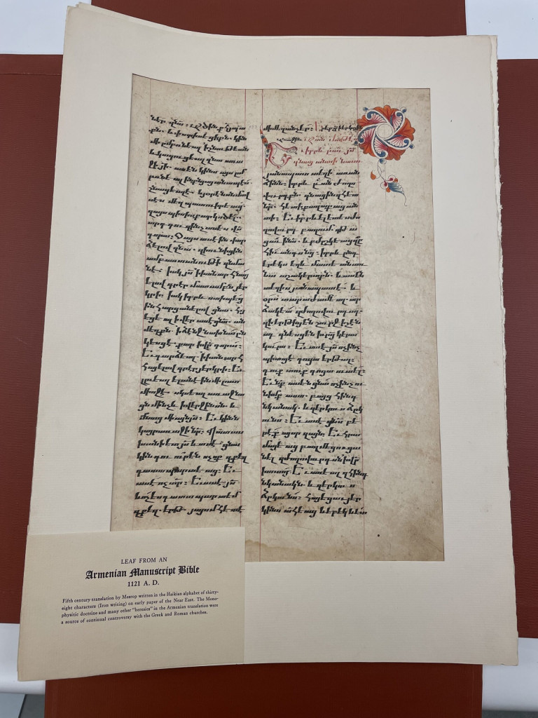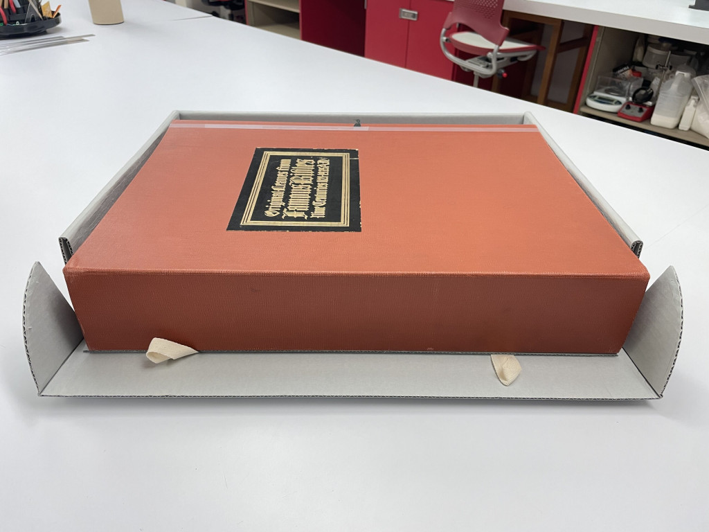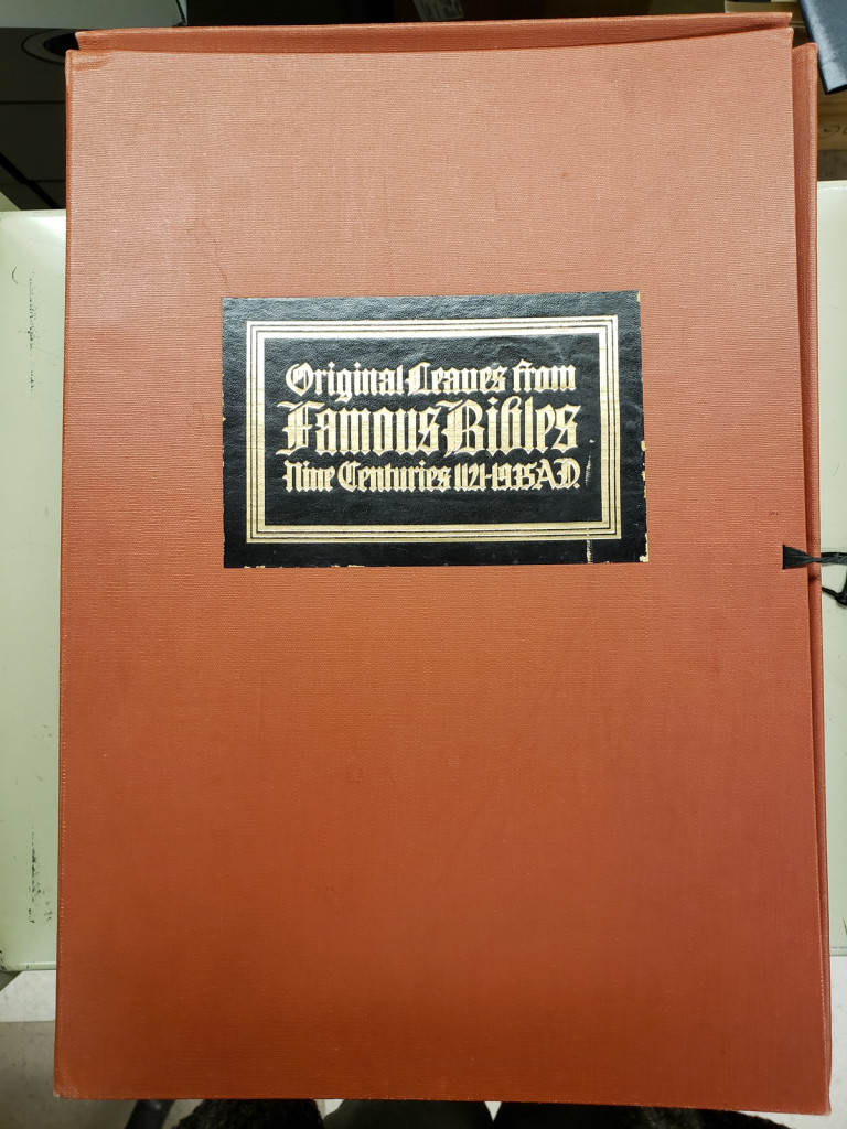 This is one of four Otto F. Ege collections owned by the Cincinnati and Hamilton County Public Library before treatment. It is titled Original Leaves from Famous Bibles, Nine Centuries 1121-1935 AD (call number R090 ffB582). It came to the lab for better long term storage.