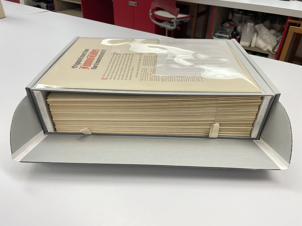 While other collections were retained within their original enclosures with a protective chemise, this portfolio was acidic and deformed with broken ties, so two new corrugated banker’s boxes were created to retain the original enclosure and store the manuscripts separately.
