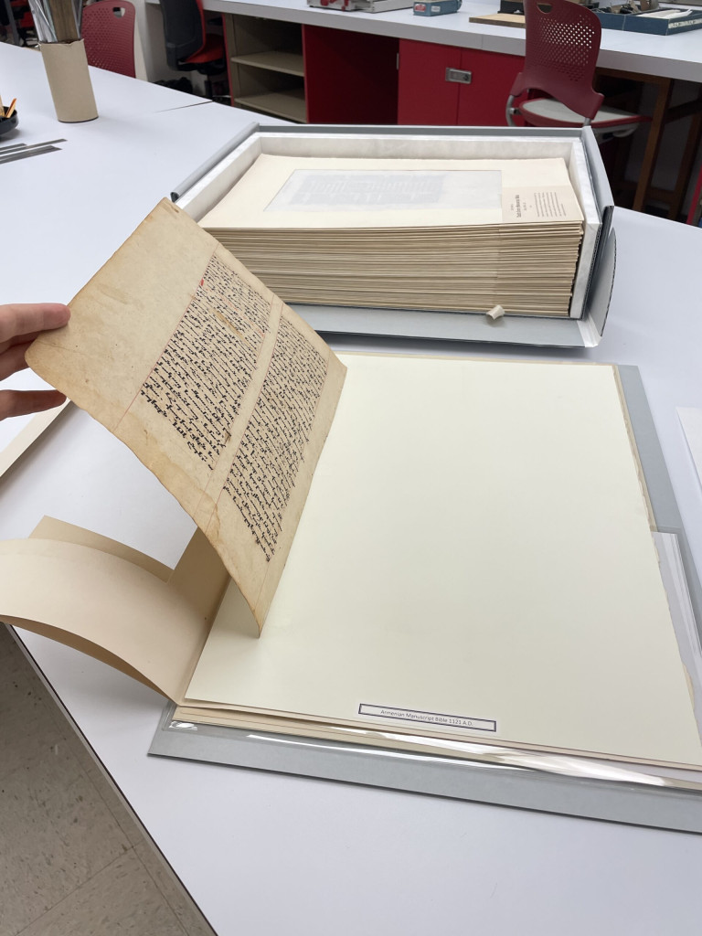 In their original format, the manuscript leaves were hinged to floppy paper folders with windows cut out for viewing. The original hinges were thick cloth, and in many cases, no longer functioning as the hinges became stuck in place. This prevented viewing the backs of the materials. The flexible folders overtime became U-shaped and were in need of supports to keep materials planar, especially during handling.