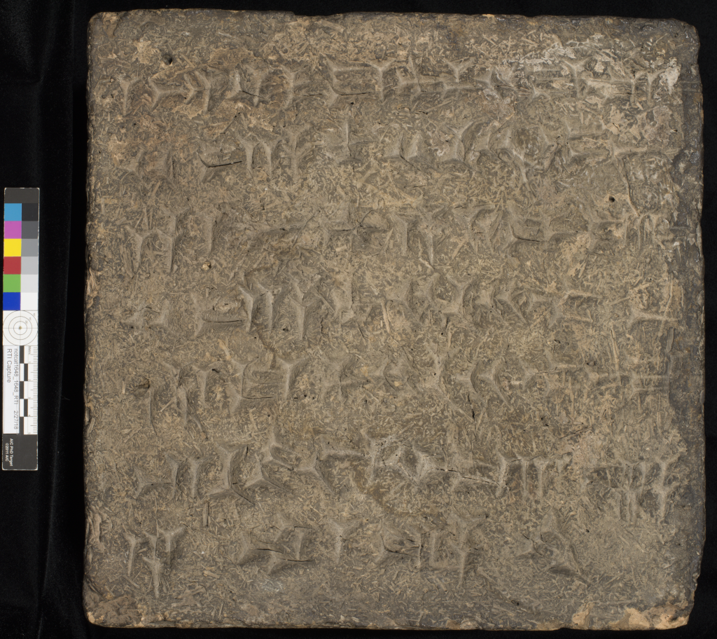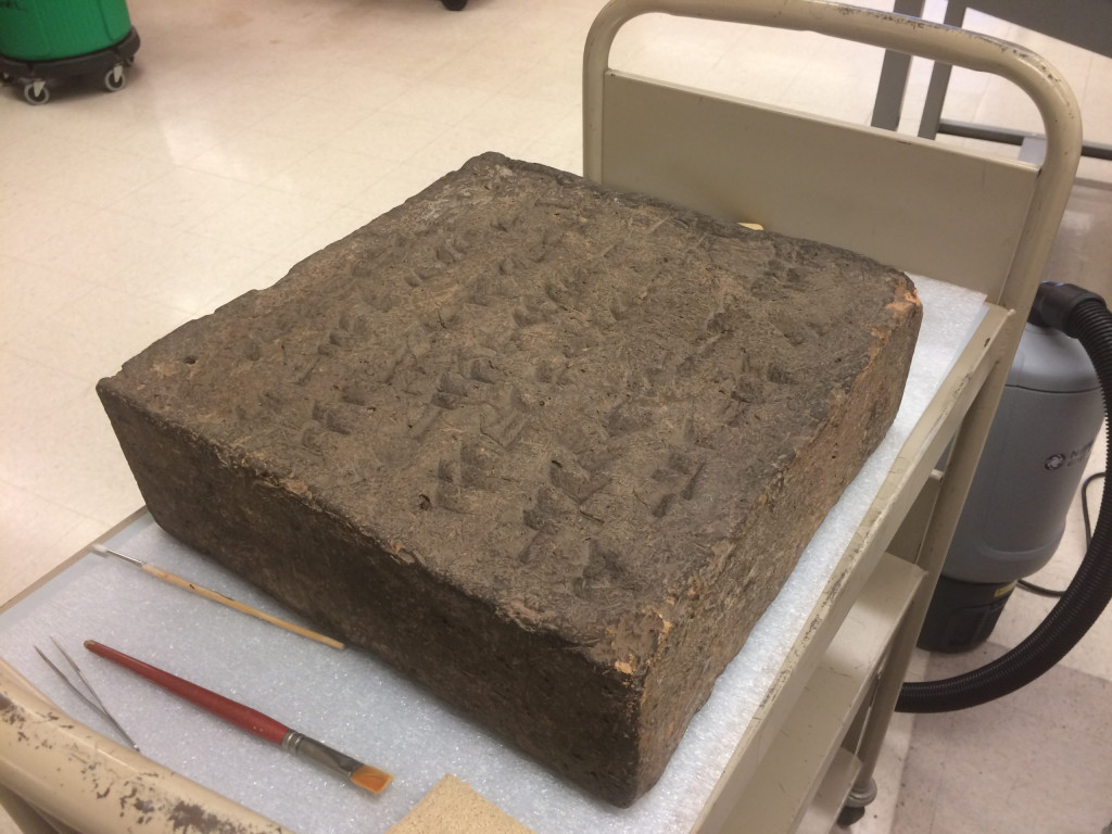 The University of Cincinnati’s Archives and Rare Books Library owns a few cuneiform tablets that date around the 1st century BCE. Most are small enough to fit within the palm of your hand. However, the clay tablet in question measures 14 inches (W) by 14 inches (T) x 4.5 inches (D) and weighs roughly 40-50 lbs.