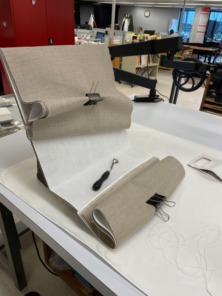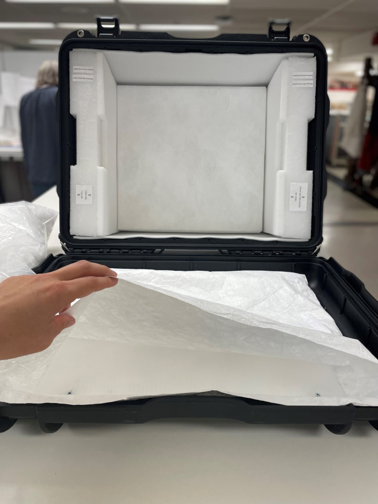 I was appreciative to have been able to hearken back to my object’s conservation experience working at the Musical Instrument Museum. My prior experience helped guide me to dust the tablet and store surface cleaning samples, however, this was a project that took me out of my library conservation comfort zone. The knowledge required to house such an object (and the amount of textile sewing used to create the cloth wrapper!) gave me even more appreciation for the work objects and textile conservators do to preserve our oversized and heavy materials – especially when transporting and taking them on and off display!