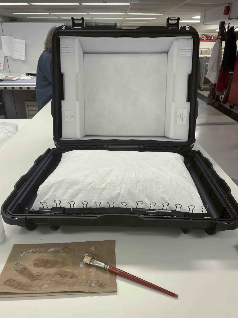 Overall, the collection of six fragments were stored together in a cloth covered clamshell, constructed by Conservation Specialist, Matt McCoy. We designed the enclosure as follows: