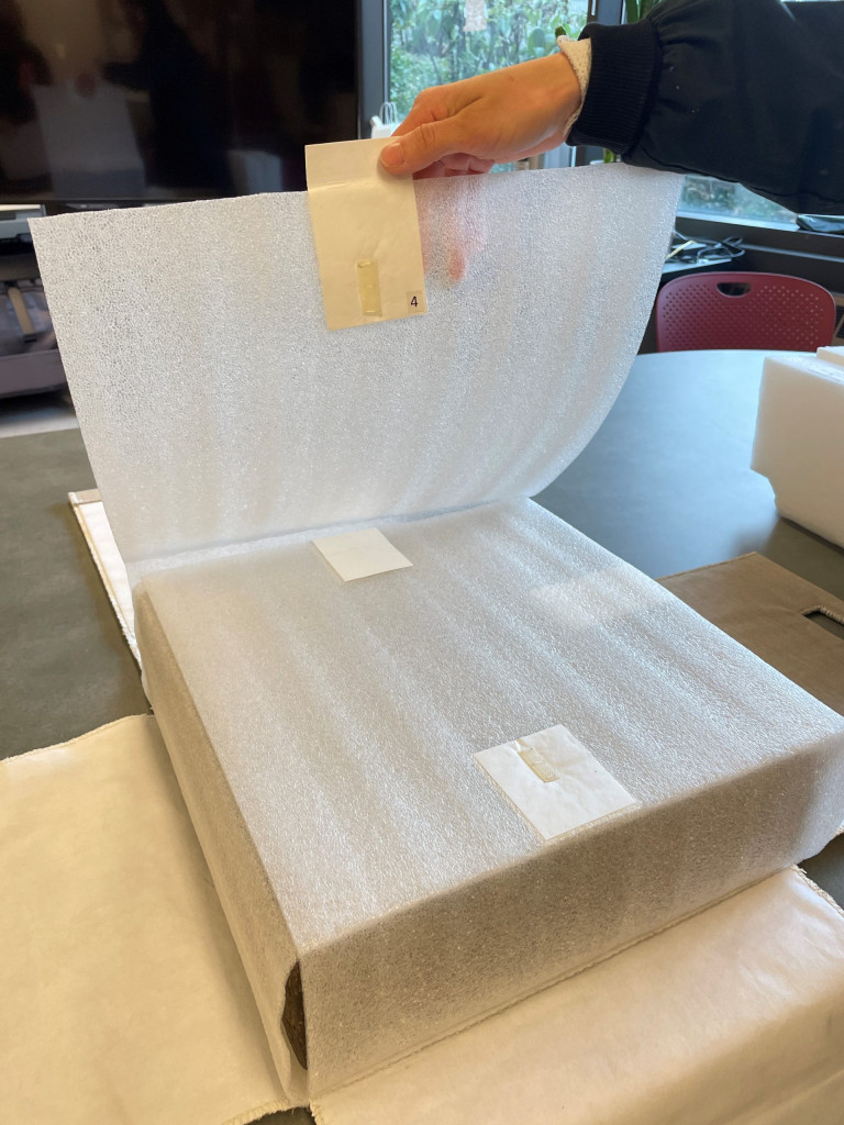 Fragments are stored individually in storage solutions that double as long-term housing. The enclosures facilitate handling as well as display. Being stored individually, the fragments are able to be grouped as necessary by their context.