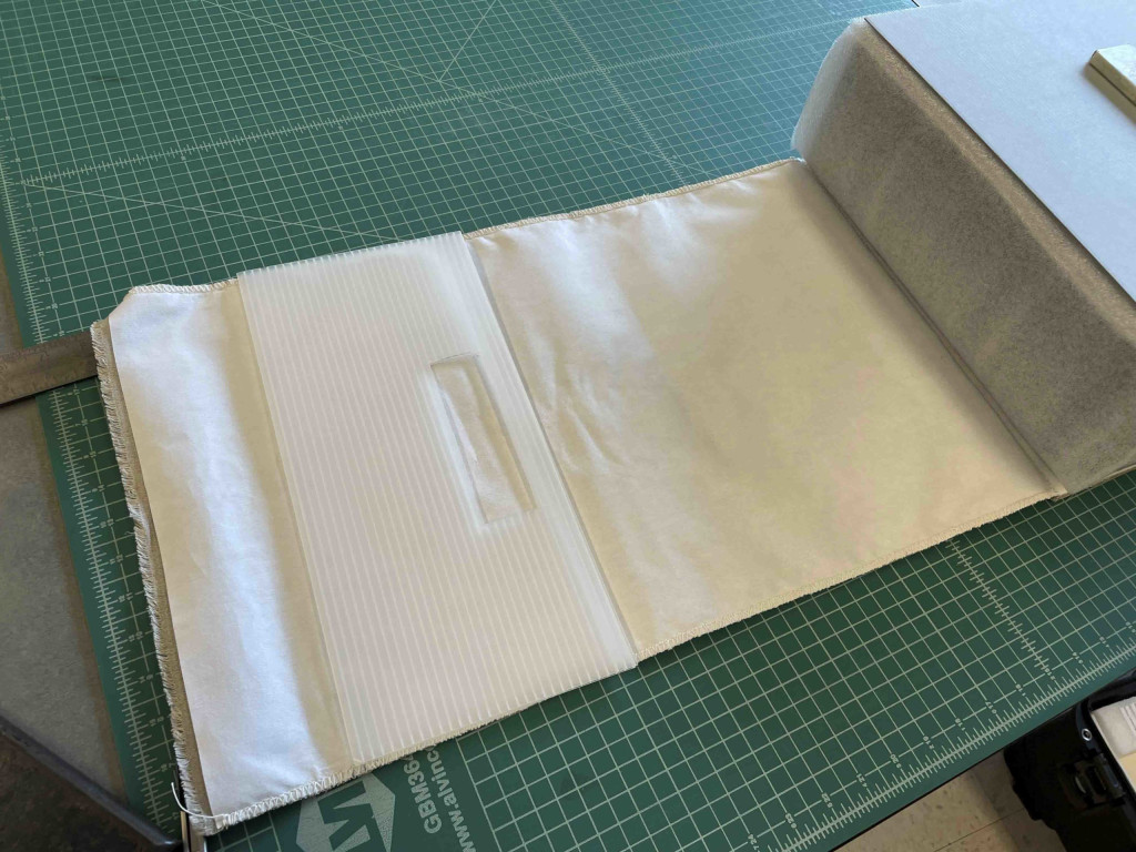 A few other alterations included using 4-ply mat board for the inset board rather than 2-ply (I used the cut out from the window mat trimmed a bit smaller), and instead of using polyester webbing adhesive, I used Jade 403 PVA along areas where the construction materials did not come into contact with the textile.