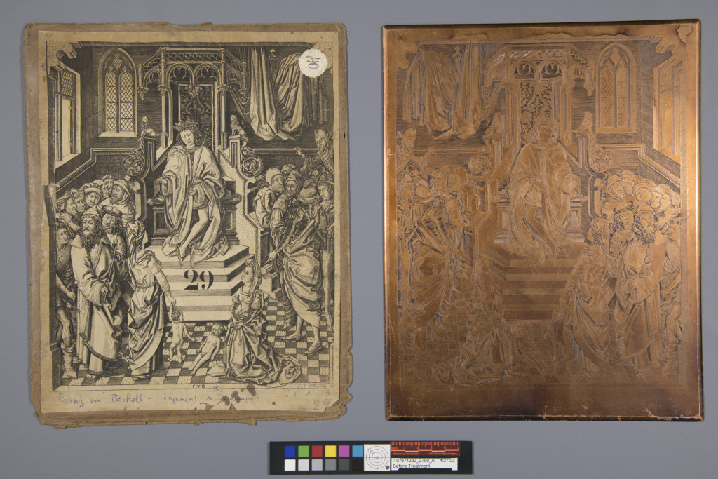 Proof print (left) and engraving plate (right) before treatment and housing.