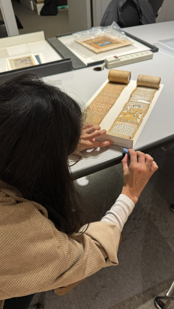 First things first, some stabilization treatment. Before tackling the housing design, the scroll underwent conservation treatment to mend small tears and fill losses, particularly at the “beginning” and “end” (depending on which direction you follow the river). Once stabilized, it was ready for some housing trials.