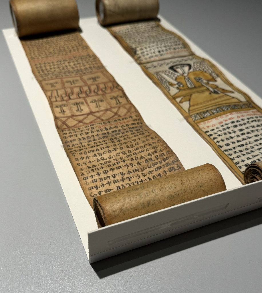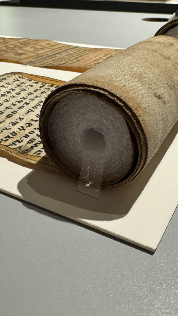 As some of the items of this collection were being prepared to go on exhibit, we had the opportunity to create mounts for other items, such as two parchment scrolls that were included in the exhibit. This was a fun project to work on, as it required us to create a support that would secure both scrolls, while providing an elegant solution for display.