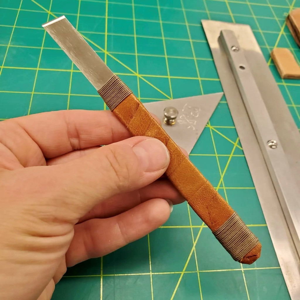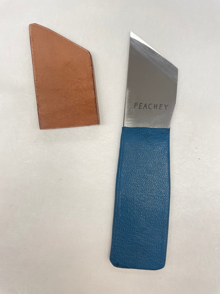 Catarina finishes a groove on the belt sander to make it more comfortable to hold. Credit: Ashleigh Ferguson SchieszerAshleigh begins her groove. Credit: Ashleigh Ferguson SchieszerMatt’s paring knife is pictured with a wooden handle and leather sheath. Credit: Matt McCoyAshleigh’s German-style paring knife with a leather covered handle. Credit: Ashleigh Ferguson SchieszerKathy Lechuga’s completed hack saw lifting knife. Credit: Signature ConservationKathy Lechuga’s rounded French-style paring knife with a leather covered handle. Credit: Signature Conservation
