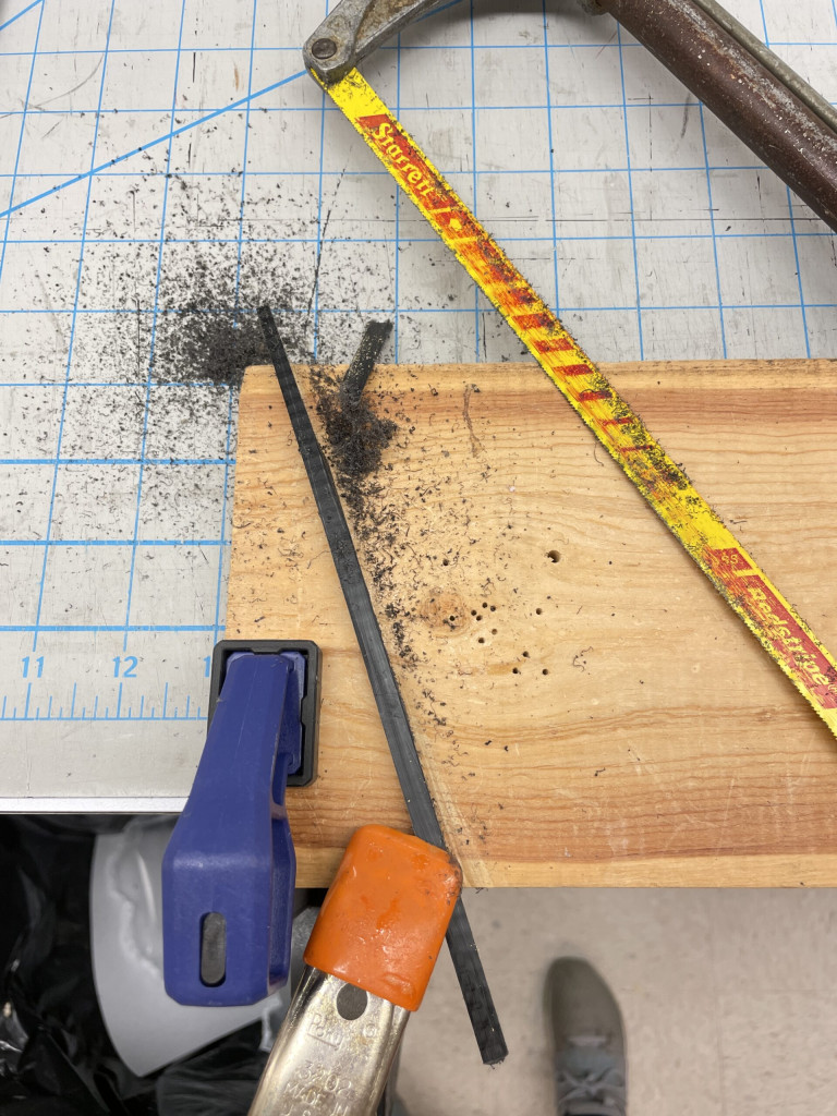 We made a rough cut of the shape we wanted with the bandsaw, then smoothed everything out by going through a sandpaper grit progression. Once we’d crafted these, many of us tried our hand at making versatile Delrin folders. With lots of filing and sanding, this malleable Delrin was easy to manipulate into a variety of tool shapes, and no two tools were exactly alike.
