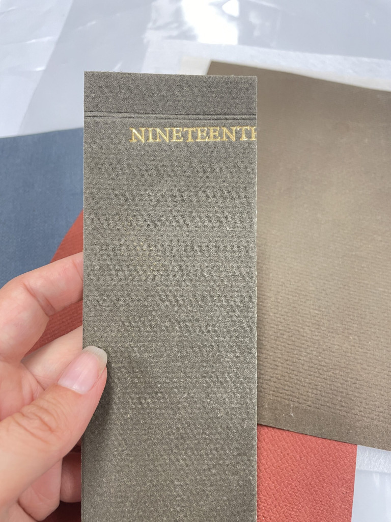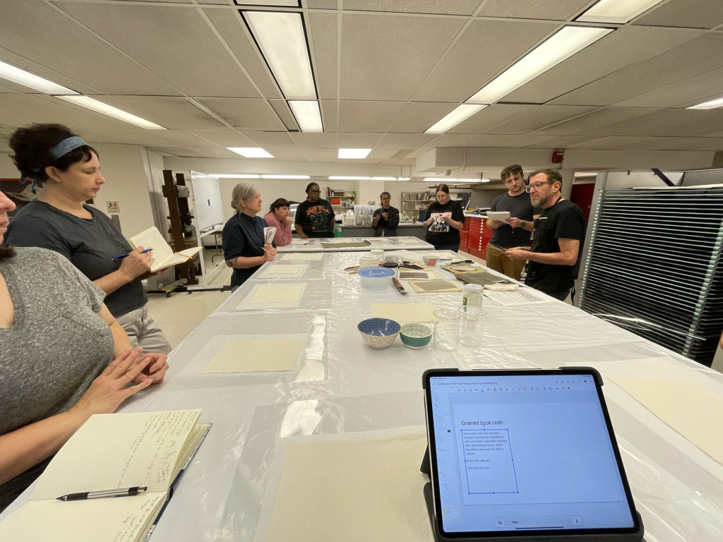 We also went over creating 19th century grained book cloth on our third day. Through toning, glazing, then pressing with a die that has your desired pattern, it’s possible to create book cloth that mimics the textures of 19th century book cloth. After going through the time-consuming process, the idea of making up large batches at one time became appealing.