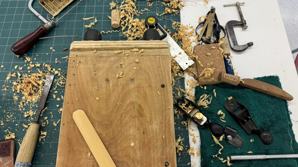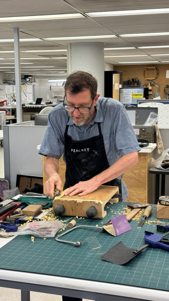 Jeff demonstrating how to carve our piece of wood using his proprietary bench hook. Credit: Jessica Ebert
