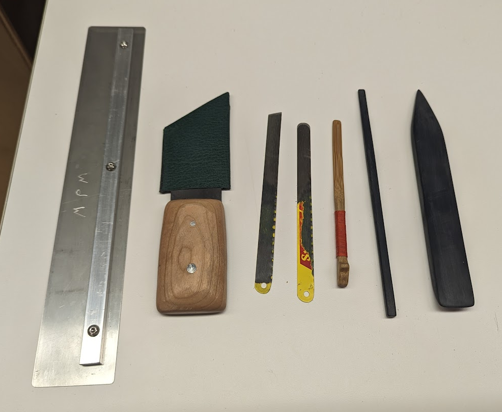 My assortment of tools I made at the workshop. From left to right: bamboo lifters, two Delrin Heras, two lifting knifes, a Delrin folder, a paring knife and its sheath, and a wooden folder. Credit: Nicole Browning
