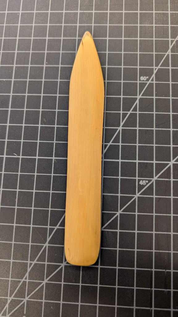 Bamboo is great for creating thin, flexible tools. With our pieces of wood most of us created folders, but a few decided to make wooden handles for their knives or straight edges. Personally, my favorite tool I created the whole week was my wooden folder I made, though it was probably the hardest to create. I had to shape it using a small hatchet, then sand it for quite some time before it took on the shape that I wanted.