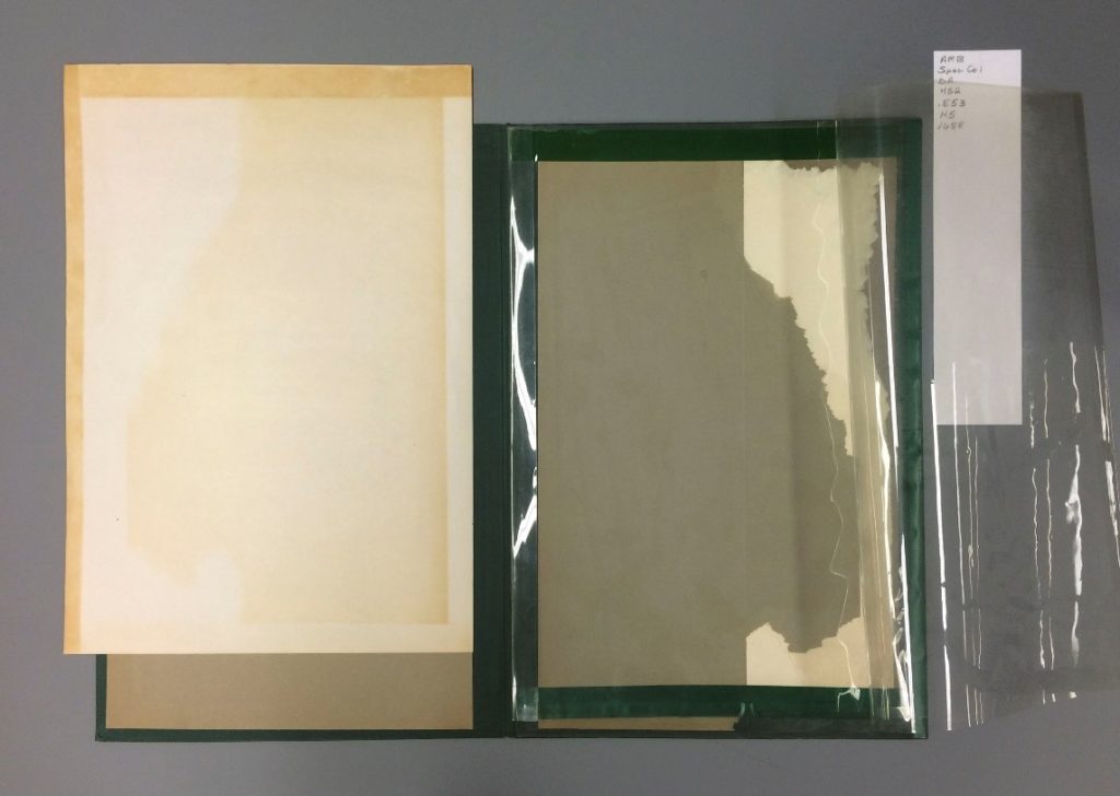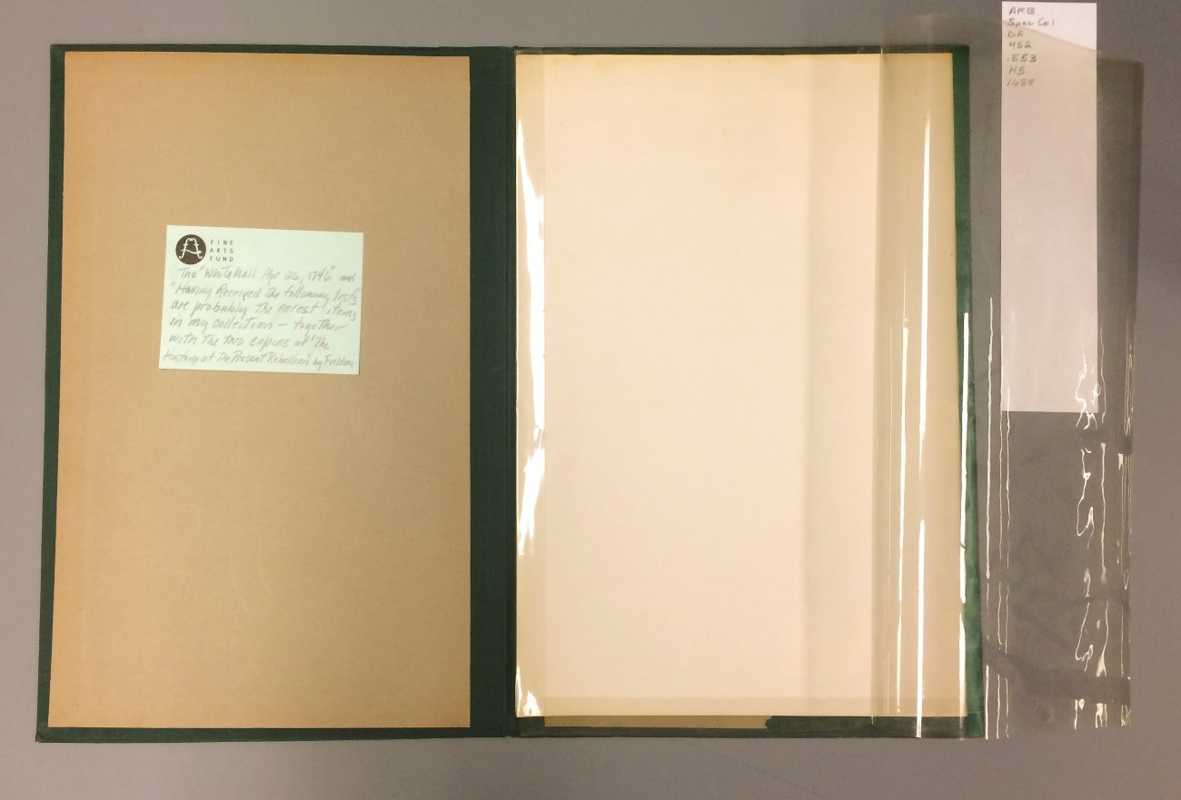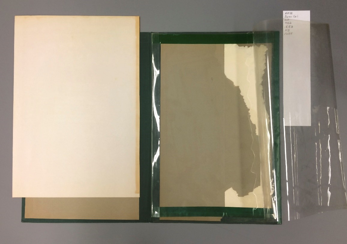 Within the portfolio, the broadside was secured beneath with folded sheets of plastic film with a blank sheet of paper. You can see the plastic film is attached to the portfolio around the edges with green tape.