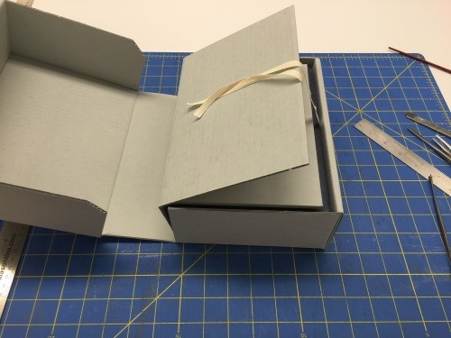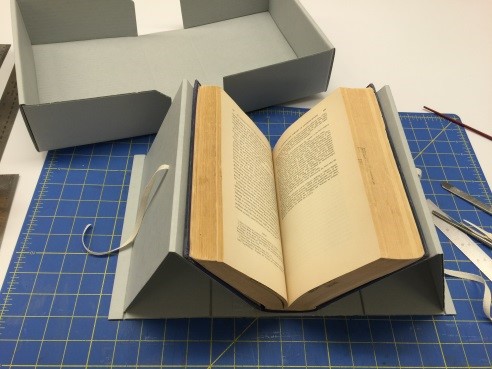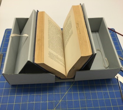 We have many occasions to use cradles. Including, in the lab while working on delicate materials and for viewing the text of fragile bindings. In an effort to create a new standard for the lab to store with a book, I revisited the construction of a collapsible cradle that fits inside a corrugated clamshell box.