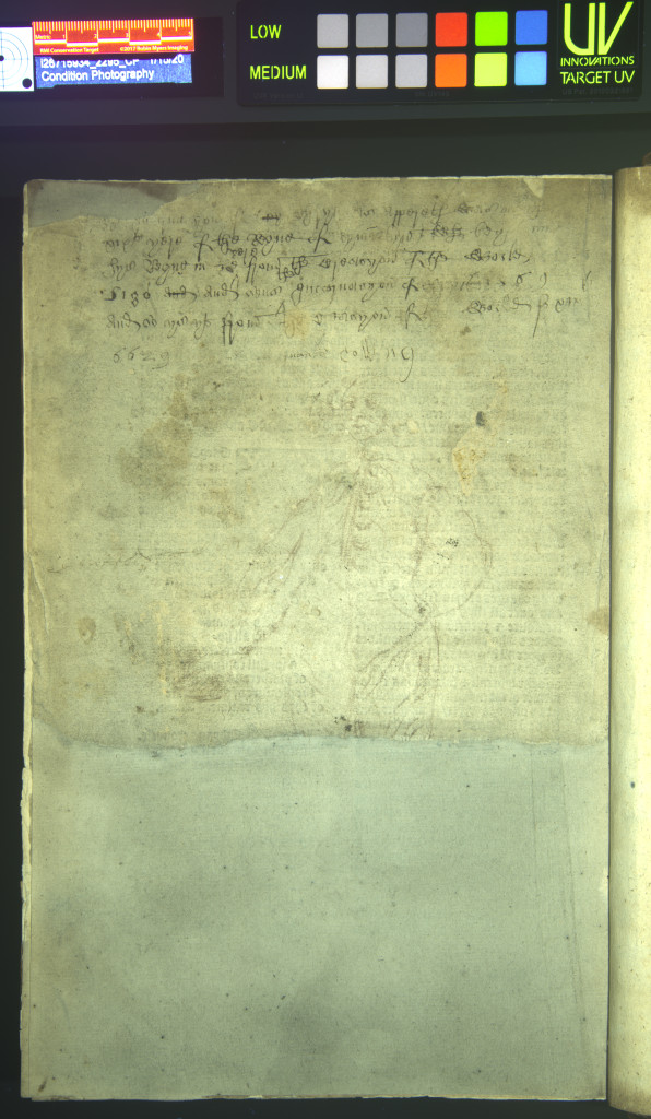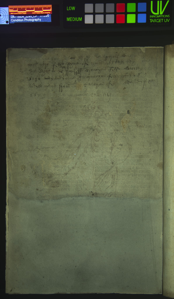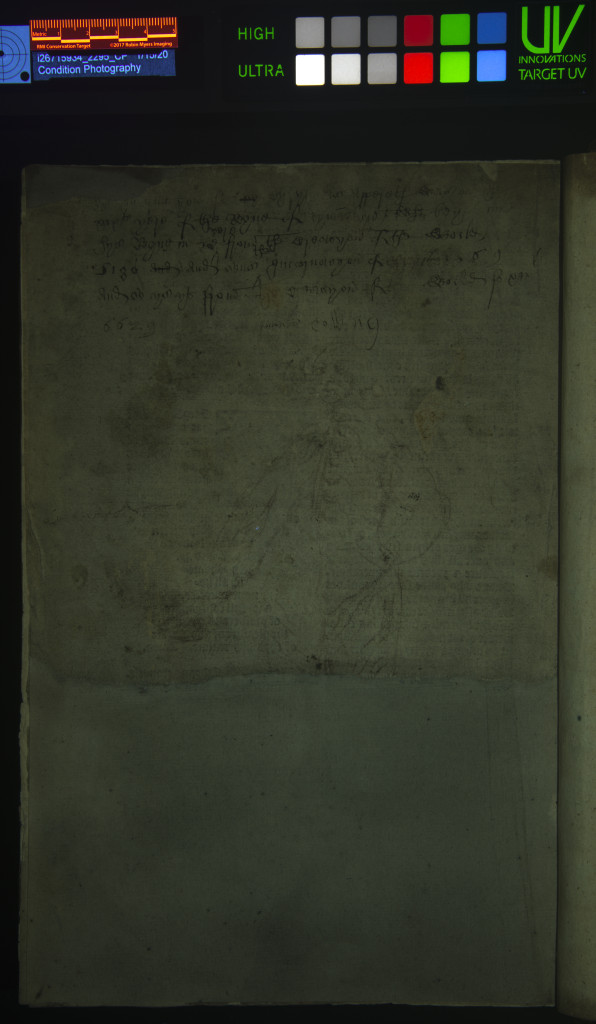 The images above depict another example of faded, scraped text. This flyleaf is from an undated Latin music manuscript that is part of the Public Library’s collection. The images below represent imaging done by the Lab, both normal illumination and UV radiation, with the goal to increase the legibility of the inscription.