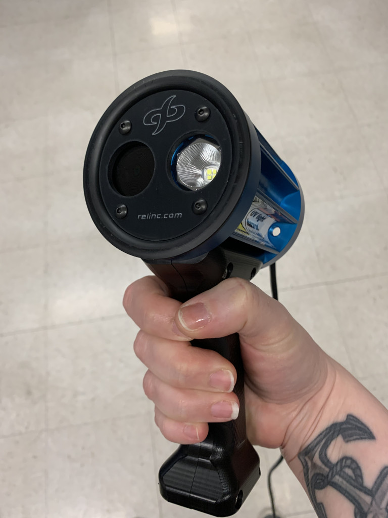 Fun facts about the REL lamp: The intensity of the lamp and the handle make it great for quick examination. It has a normal LED built in as well and you can have both functions on at the same time, making it easier to see if you’ve turned your studio lights off or if you want to do a quick comparison of normal illumination vs UV radiation. As with any UV radiation source you want to keep it away from your object until you are ready to image. When using a radiation source you also want to let the lamp warm up for at least one minute before imaging (away from the object or with the object covered). This is because when a lamp is initially turned on it can emit up to eight times more UV radiation, and allowing the lamp to warm up gives the output levels a chance to even out, making it much safer for the object.