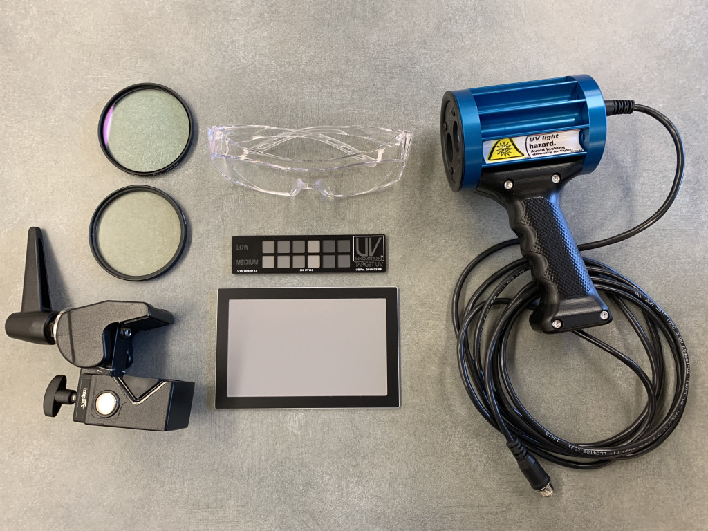 Right to left, top to bottom: filters, SuperClamp, UV Glasses, Target UV, UV Gray Card, REL lamp