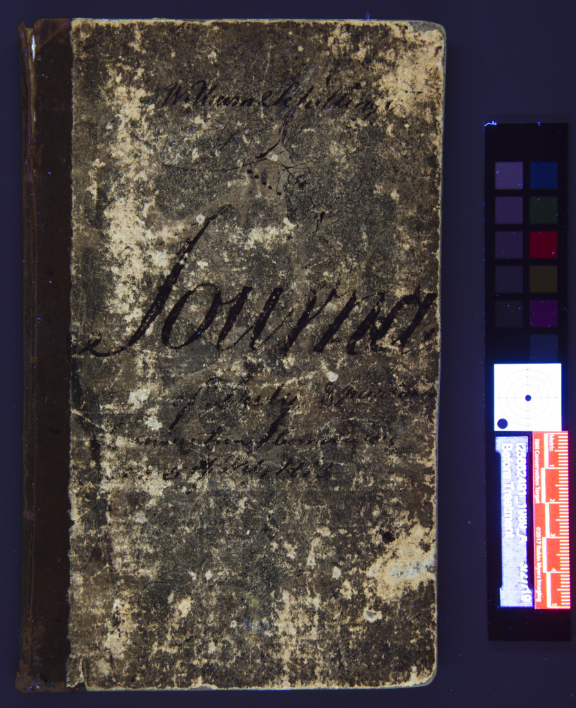 You may recall back in September of 2018 when we shared an article I had written in our UC Libraries’ newsletter about photographic documentation in the Lab and a recent workshop I had attended through FAIC: http://libapps.libraries.uc.edu/source/photo-documentation-in-the-preservation-lab/ If you missed it, basically the workshop focused on a standardized and replicable UV/visible fluorescence documentation workflow, and was taught by Conservator Jennifer McGlinchey Sexton at Duke University. It was a fantastic workshop and I came back from it with a plan for a new UV workflow and a list of equipment for an improved UV setup. However, conservation photography equipment can be pricey, especially when you are embarking on improving a very specialized setup, like UV. On top of that we had just included a Near Infrared workflow into our photography repertoire and our budget was feeling the strain. So we took the smart approach and slowly bought equipment, here and there, when the budget allowed. Finally, we now have all the equipment we need for the new setup. Check out the results from today’s session: