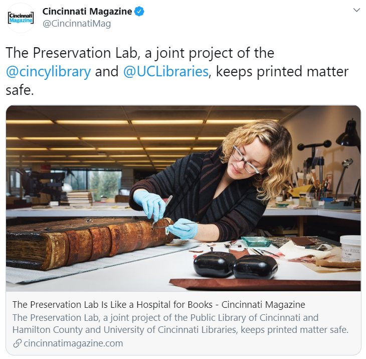To celebrate national Preservation Week (April 25 – May1, 2021), staff at the Preservation Lab are sharing the following answers to the question below as they reflect upon the wealth of library resources located in the Cincinnati community: