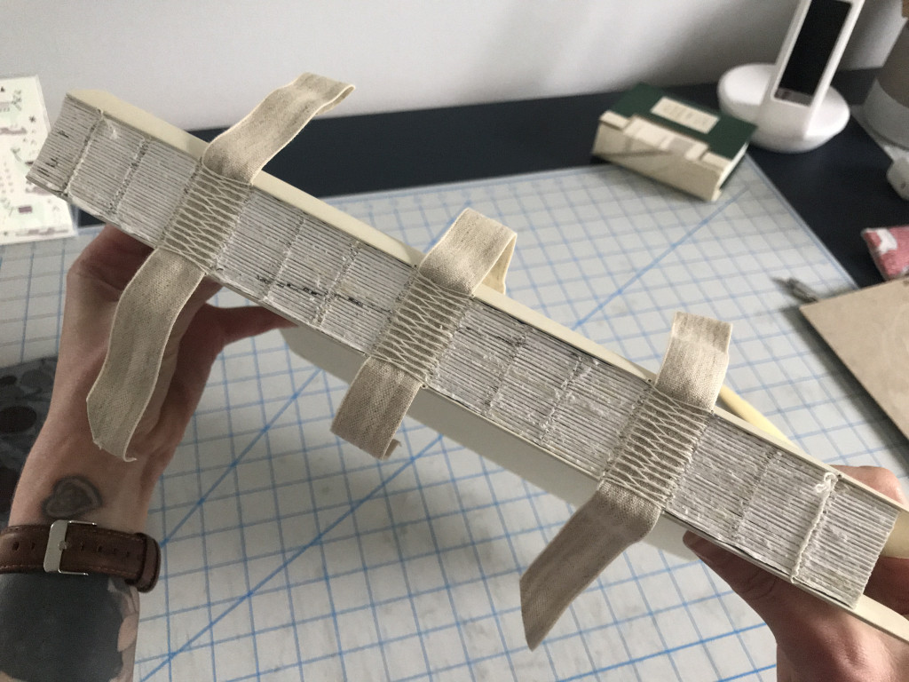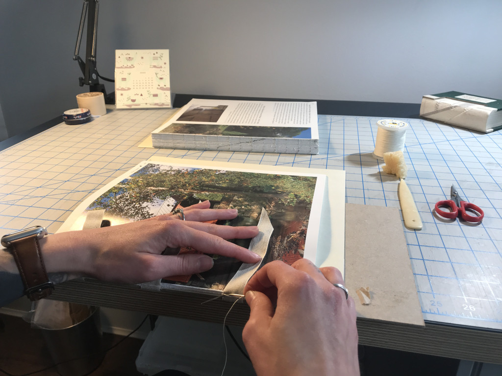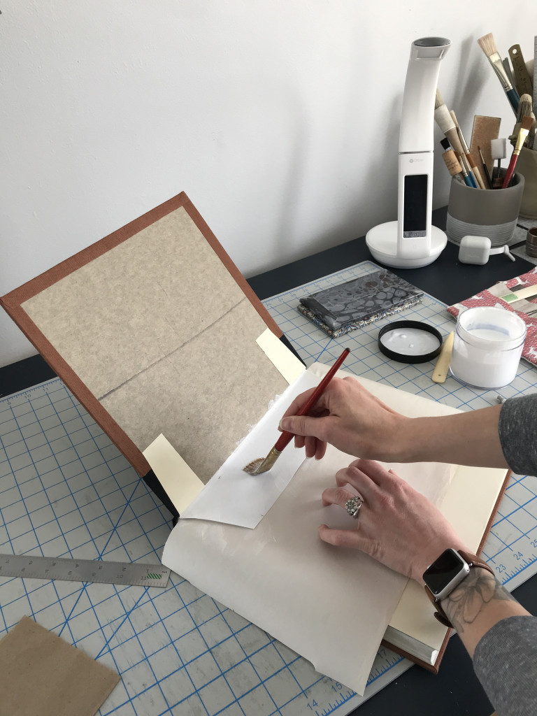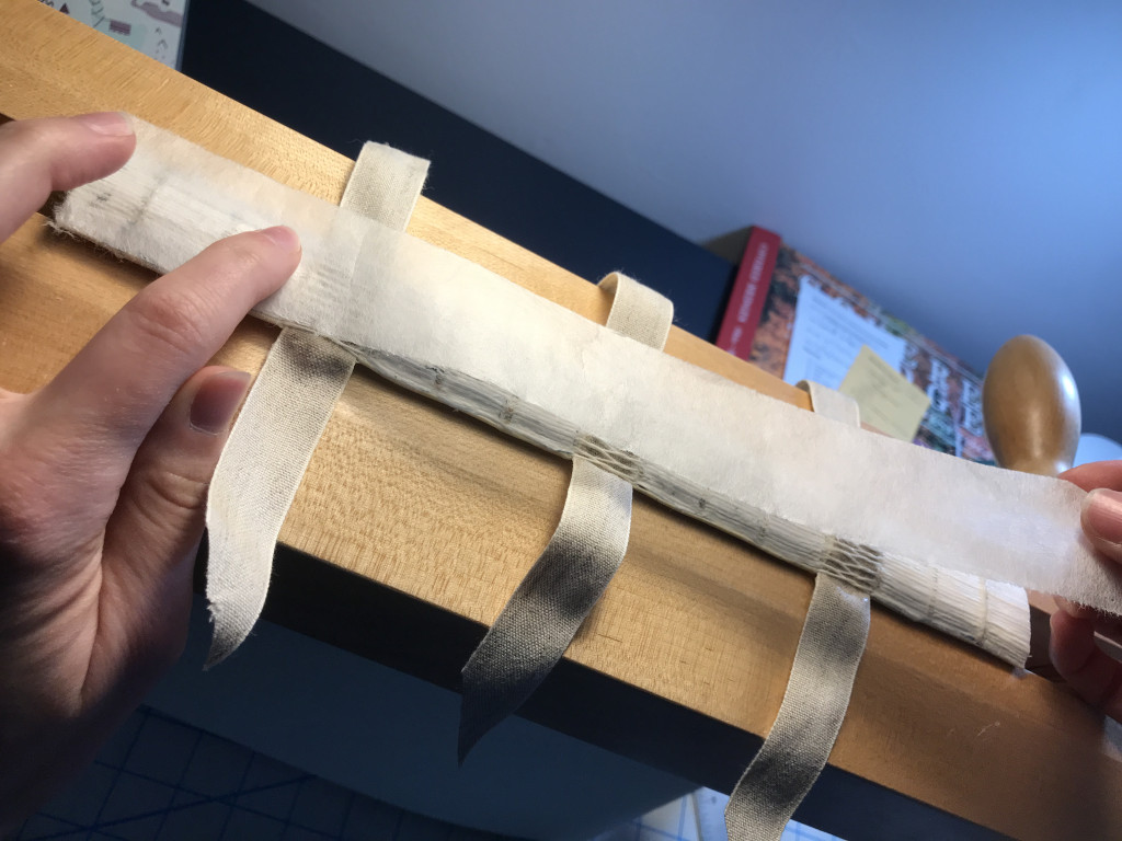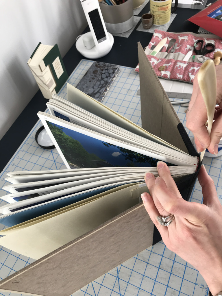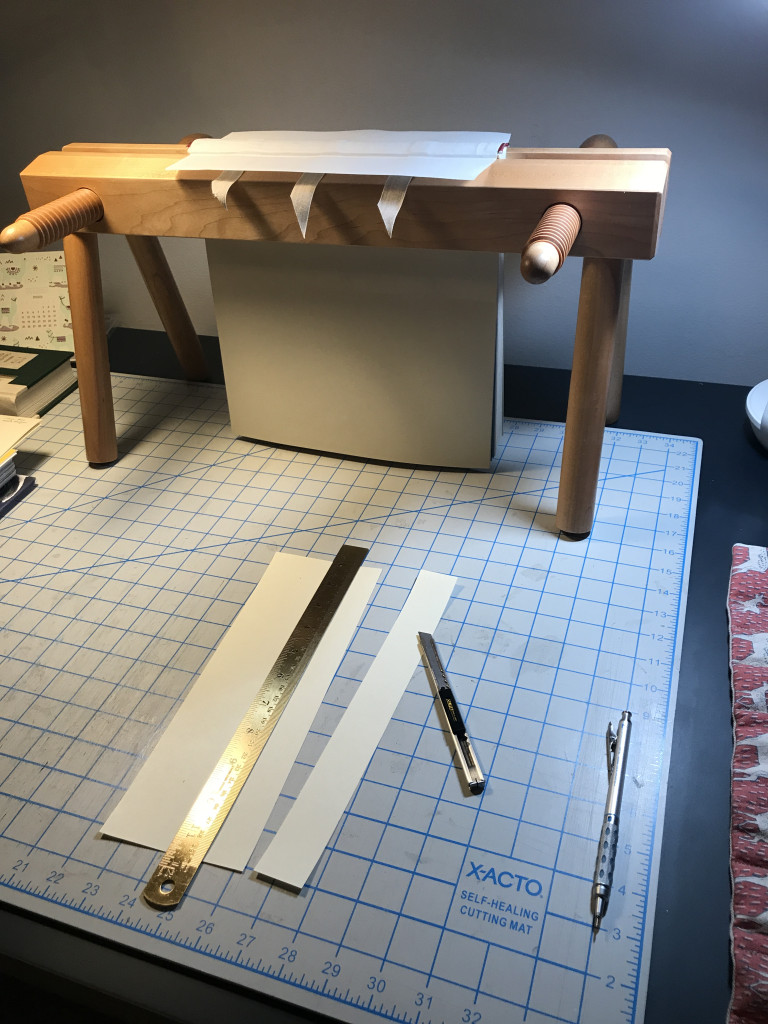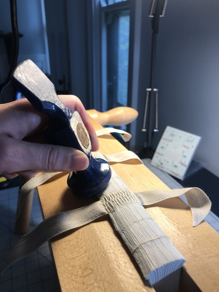 I particularly enjoy the problem solving nature of special collection treatments and thus, my “favorite” treatment is usually the one I’m working on. Currently, I’m treating a Haggadah owned by Hebrew Union College that dates to 1526 or 1527. While I’ve treated other haggadahs from HUC, including this one, this project involved iron gall ink treatment AND rebinding a textblock with two different sized leaves, or pages, into its original historic leather cover. Because the binding had been previously treated and reformatted with materials that did not age well, collaboration with the librarians at HUC required exploration into whether we wanted to re-create the past reformatting option with longer lasting materials, or perhaps, explore a new option altogether. Before we committed to a solution, I created a model to test out a new option since unanticipated questions or outcomes often arise during experimental pursuits. For that reason, it’s better to problem solve on a model, rather than on an actual special collection material. In the end, the librarians and I were happy with the results of the new option, and I’m currently at the stage where I’m ready to start rebinding the pages of the actual object.