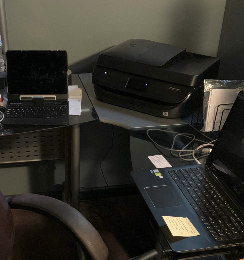 While her husband has taken over the front porch – many of our family members are also working from home.
