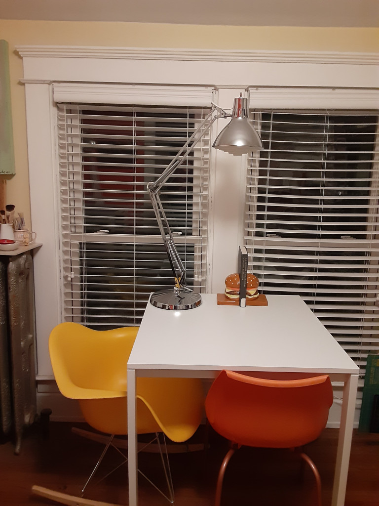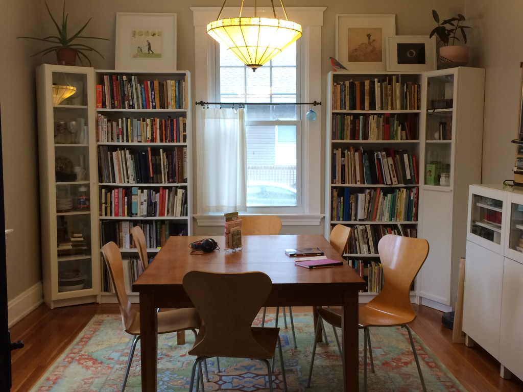 Hyacinth’s kitchen table setup is perfect for sewing music. Upsides: great natural light and proximity to coffee. Downside: too close to cookies!