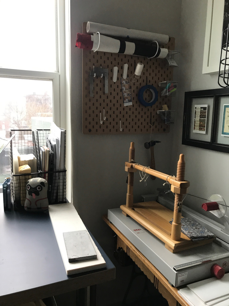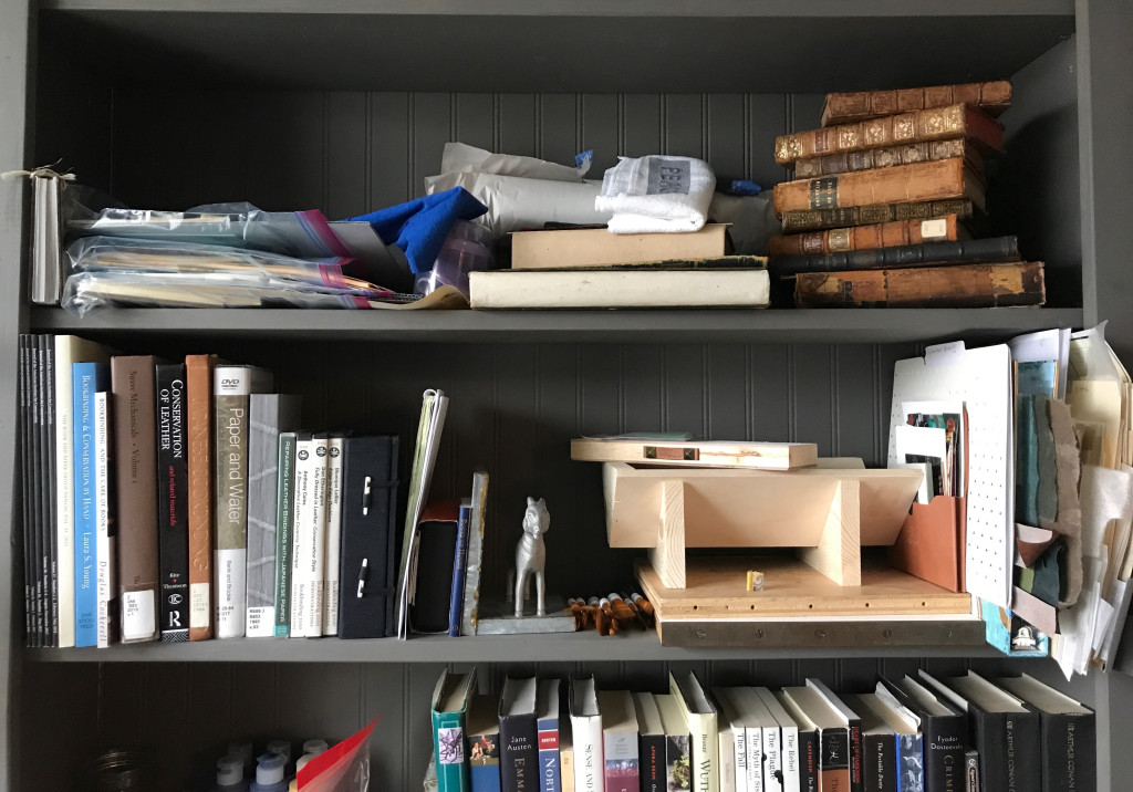 The guest room closet is retrofitted to hold bookbinding supplies.