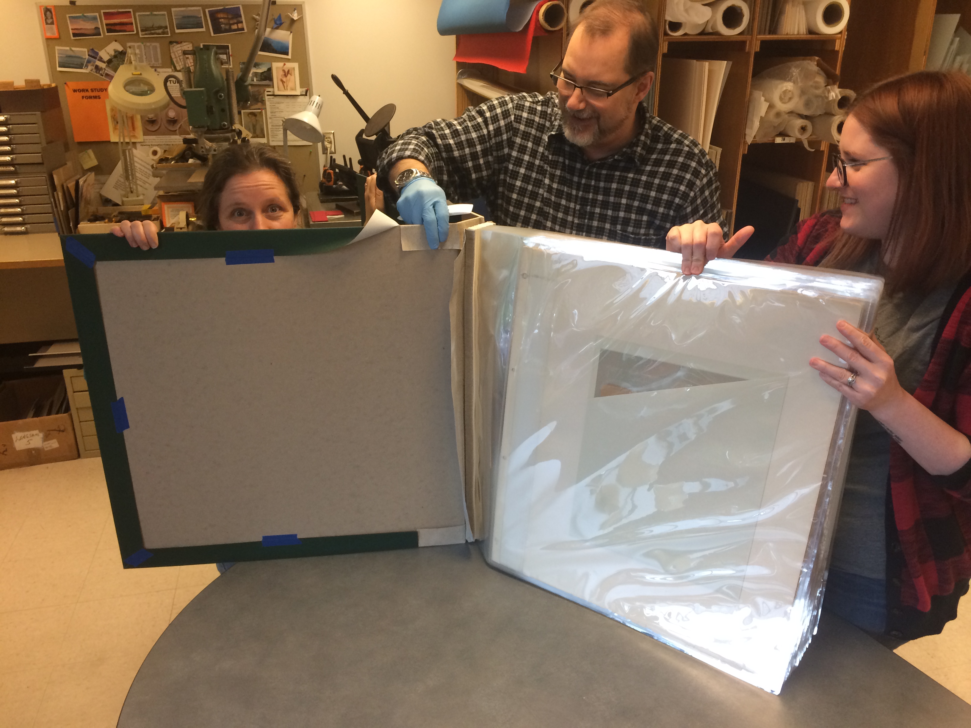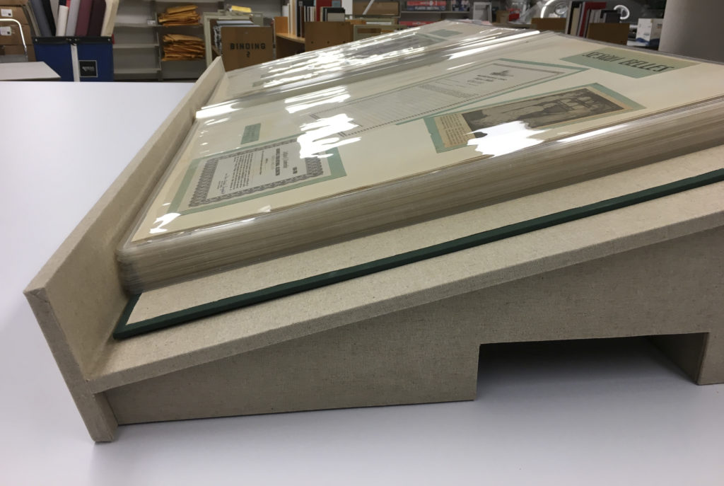 To conclude the project, the lab held an in house workshop where we archived our inventive encapsulated page solutions. Staff made two models– a post bound structure with a plethora of attached parts  – and a side sewn version. Since Althea, the lab has tackled treatment of over a dozen other scrapbooks – including an oversized album with an opening spread of over 4 feet. Having tackled such a complex encapsulated binding as one of our first endeavors, we’ve developed our own language for scrapbook parts, such as “Chibap” (which refers to the acronym CHBAP, a Cloth Hinge Board Attachment Part), and the techs have discovered that they are armed with skills to problem solve any scrapbook that comes their way.