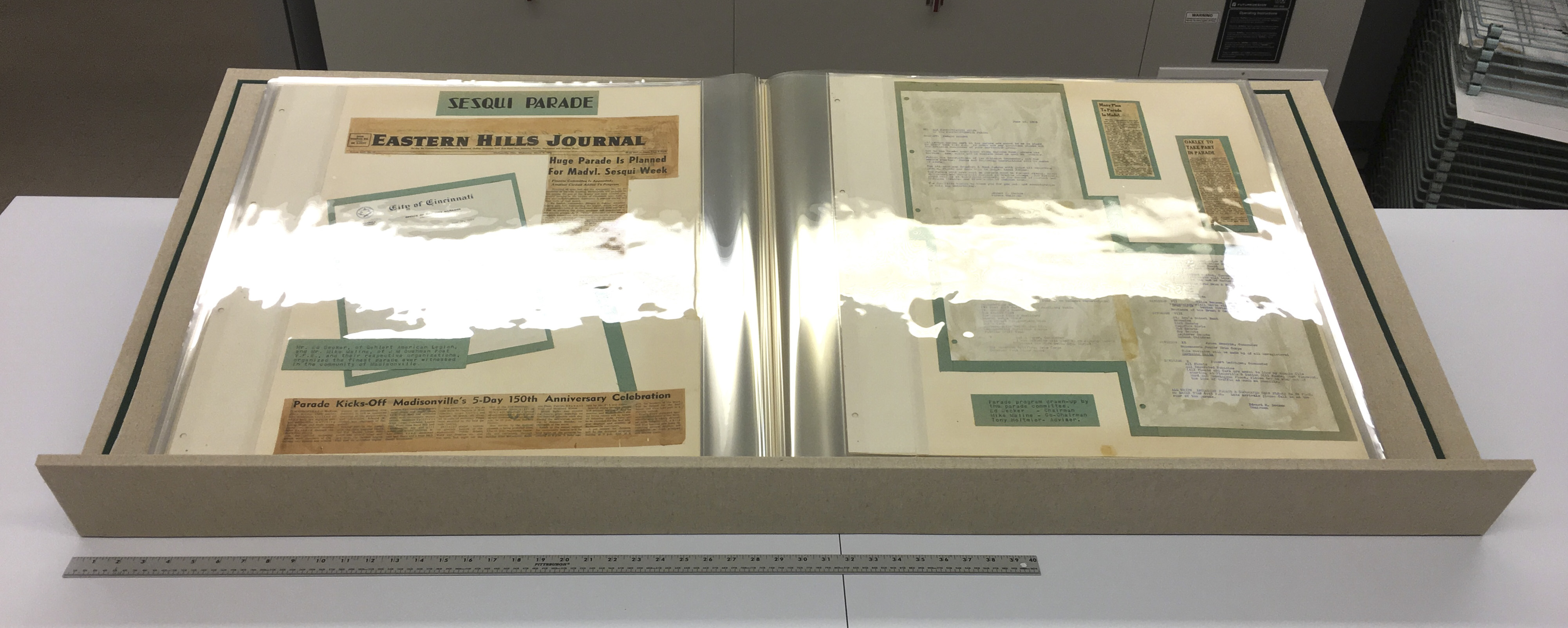 Due to their collection of content, scrapbooks usually are bursting with problematic preservation issues.  Often, fragile pages hold stiff, brittle, or heavy parts that are adhered and folded.  Components are frequently found layered and overlapping.  These parts are filled with information and are intended to be handled and experienced; however, as the parts become fragile with age they are nearly impossible to touch without causing damage.