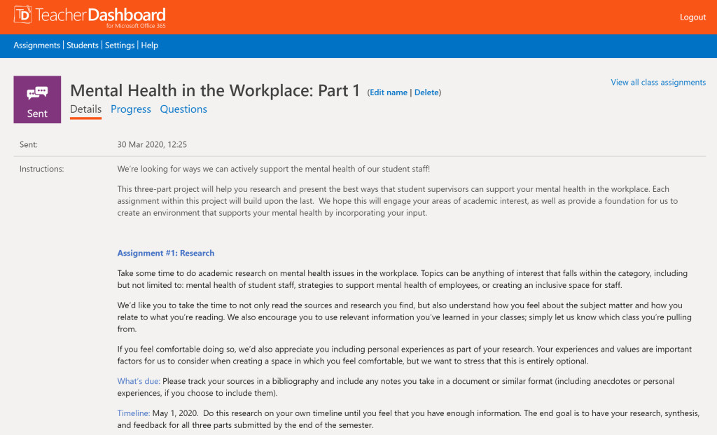 Sidney and I decided to focus our assignments on mental health in the workplace, knowing that Lexie, as a Secondary Education major, and Christine, as a Psychology degree graduate starting her PhD in Psychology, would be passionate about this topic. The project includes three parts: research, synthesis of research and self-reflection, and recommendations for the Lab. Throughout the project we have been using Microsoft Teams to assign projects, communicate, share files, and offer feedback. And it is of no surprise to us that Christine and Lexie are doing a phenomenal job of their projects so far!