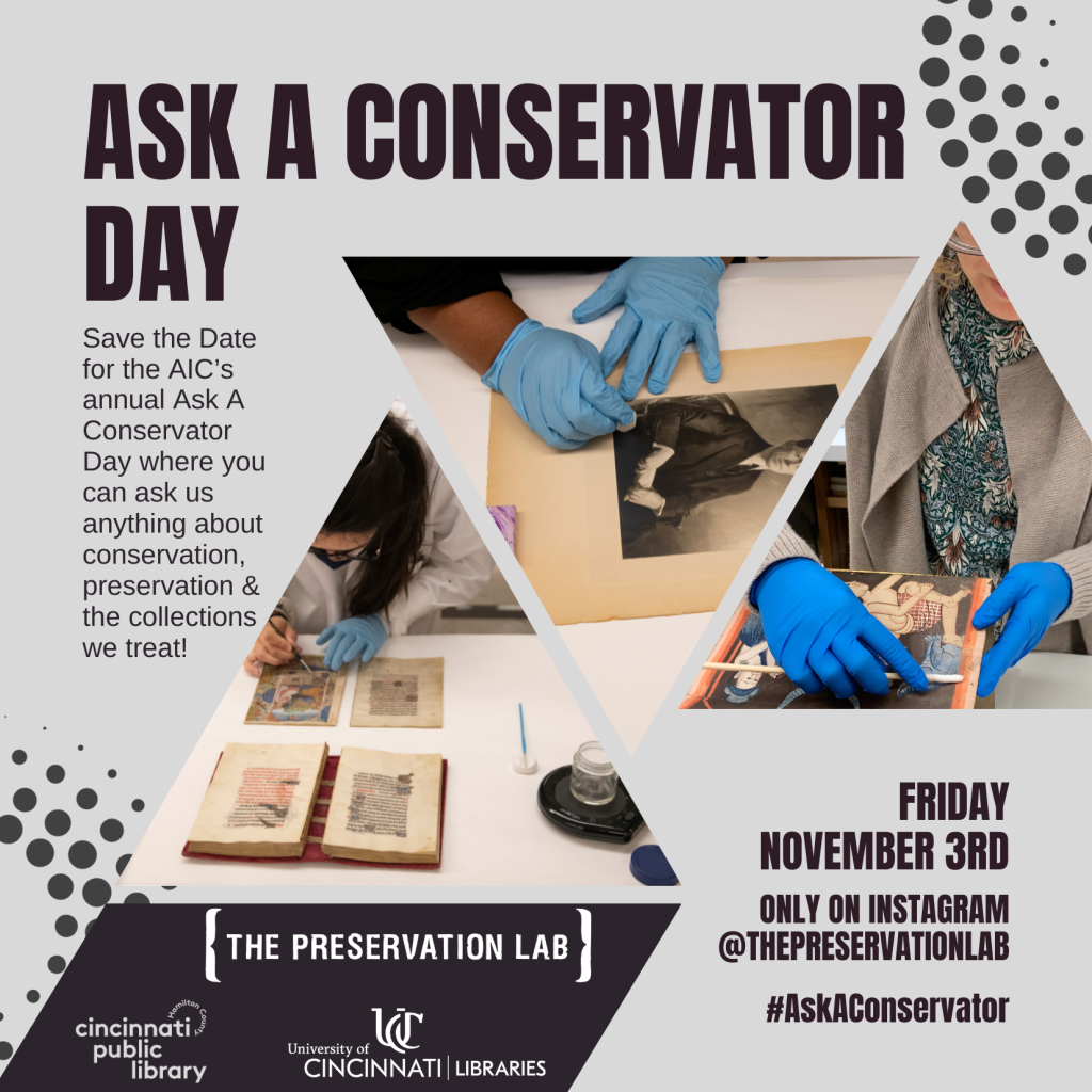 In celebration of ALA’s annual Preservation Week (April 24th-30th), Preservation Lab staff will be offering live demos and show & tells this week and next, both at UC Libraries and the Cincinnati and Hamilton County Public Library: